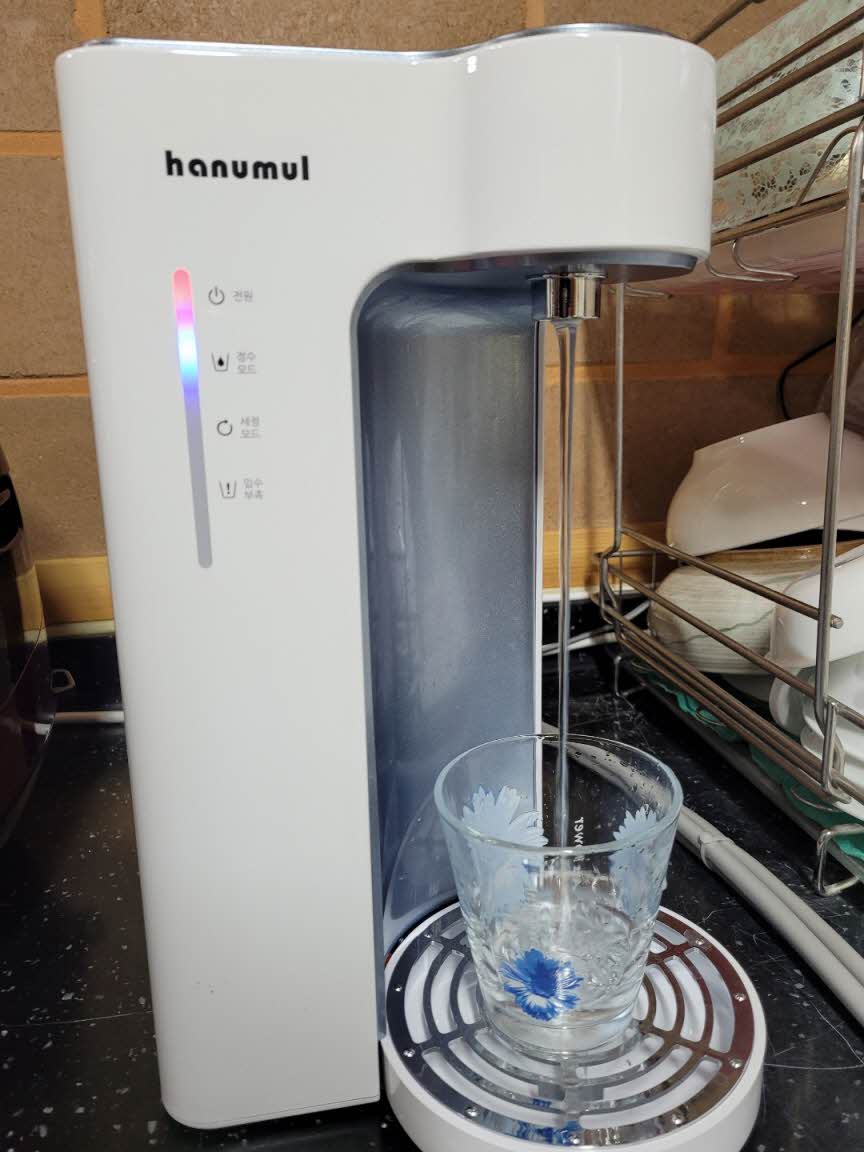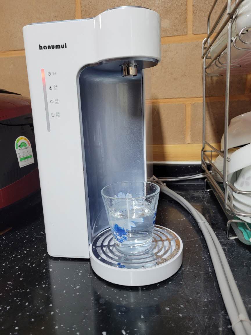 정수기 버튼을 잠깐 터치하면 한컵량이 출수되는데 아침에 일어나 마시면 맛, 목넘김이 부드러워 좋아요.
