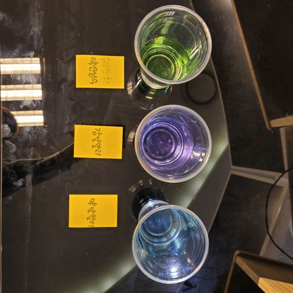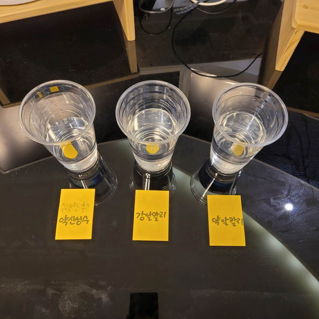 그래서 컵에 약산성수, 강알칼리, 약알칼리를 담고 시약을 떨어 뜨려 보았어요.