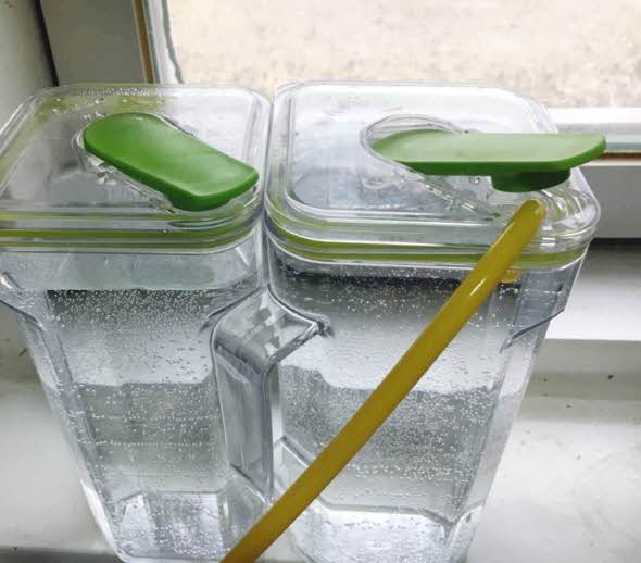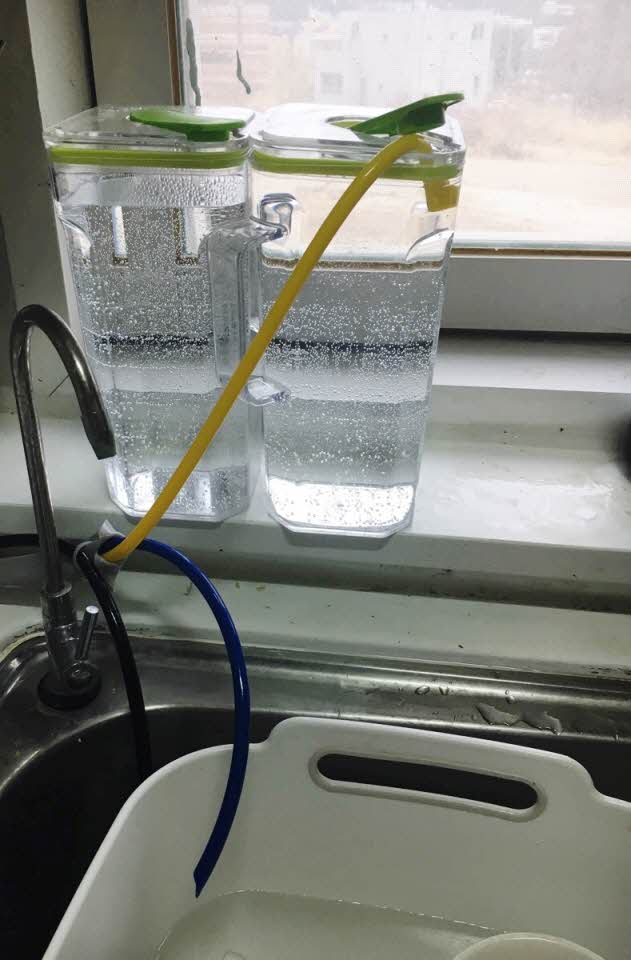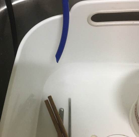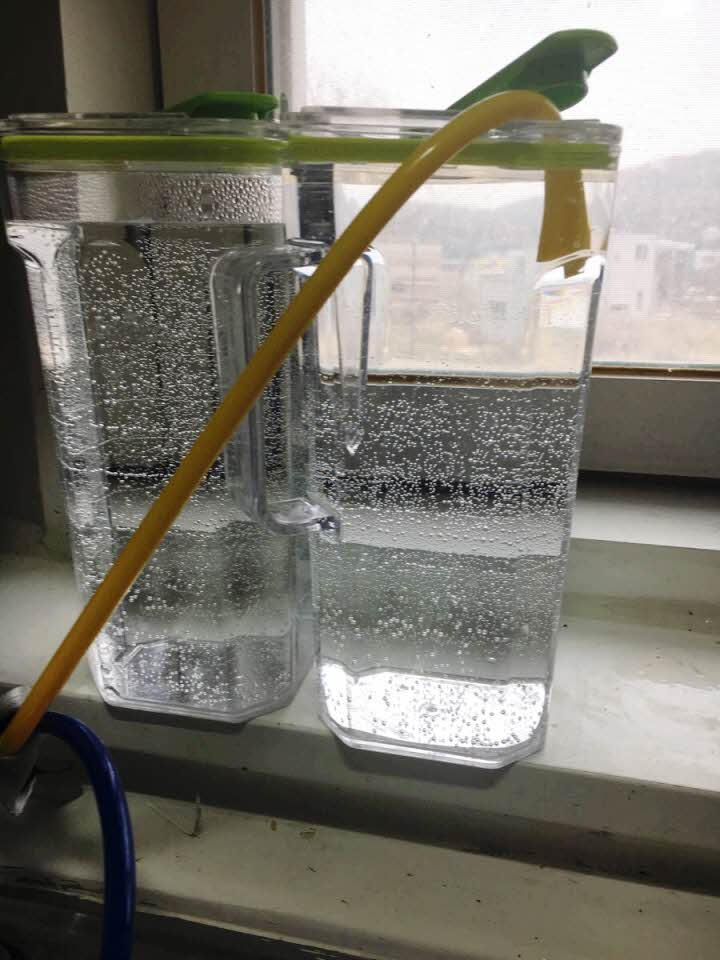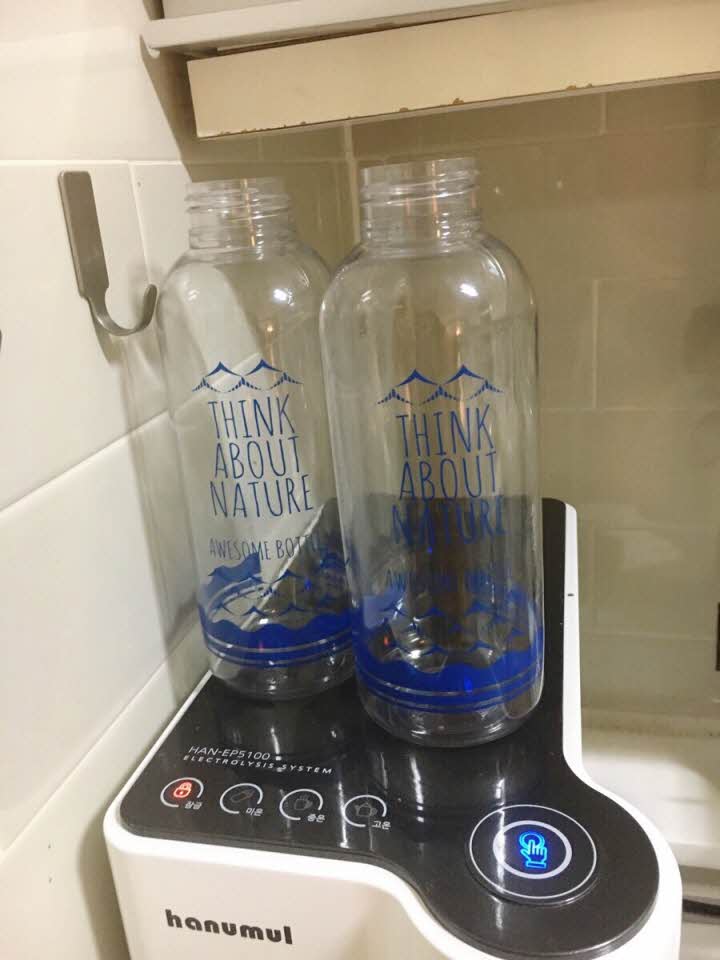 파란색은 설거지통에 나오도록 해서 설거지수로 활용합니다. 산성수는 1.5L 트라이탄 물병을 사서 이렇게 따로 담기게 하고 있어요.