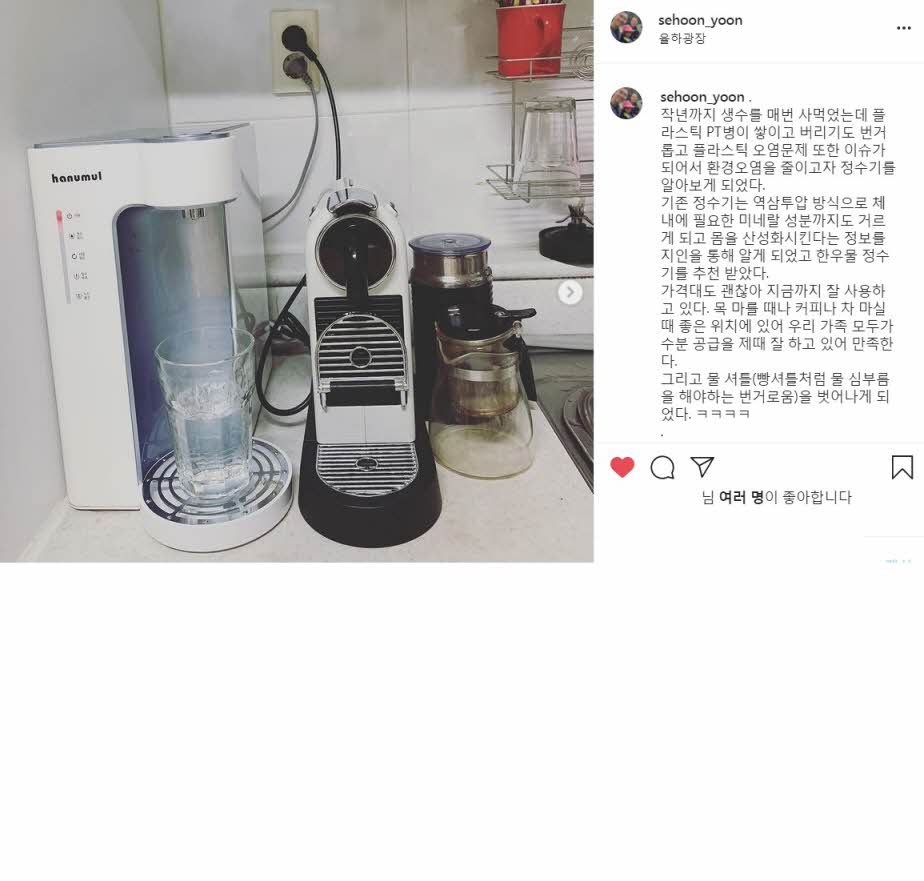 가격대도 괜찮고 건강까지 생각할 수 있어 사용후에 주변 지인들에게도 소개하였고 지인도 마셔보더니 기존 정수기보다 물맛이 좋다고 했습니다. 목 마를 때나 커피, 차를 마실 때 좋은 위치에 있어서 우리 가족의 좋은 수분 공급원이 되어서 모두가 만족하고 있습니다.