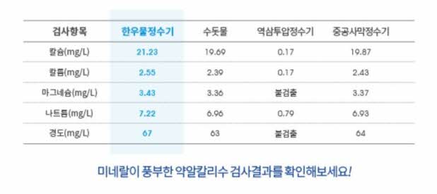 한우물 정수기를 통해 만들어지는 약알칼리수는 원수(수돗물)보다