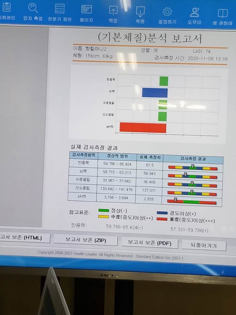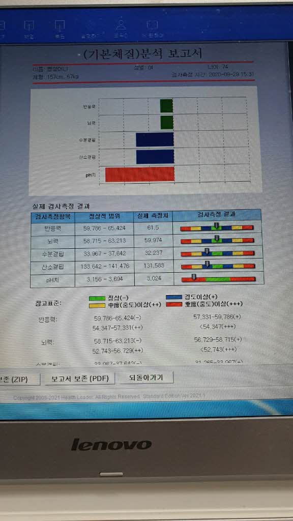 그중 눈에띄게 새빨간 색이 길게 보이길래 그게 무어냐고 물으니 '(기본체질)분석보고서' 인데 pH치를 알려주는거 였어요.