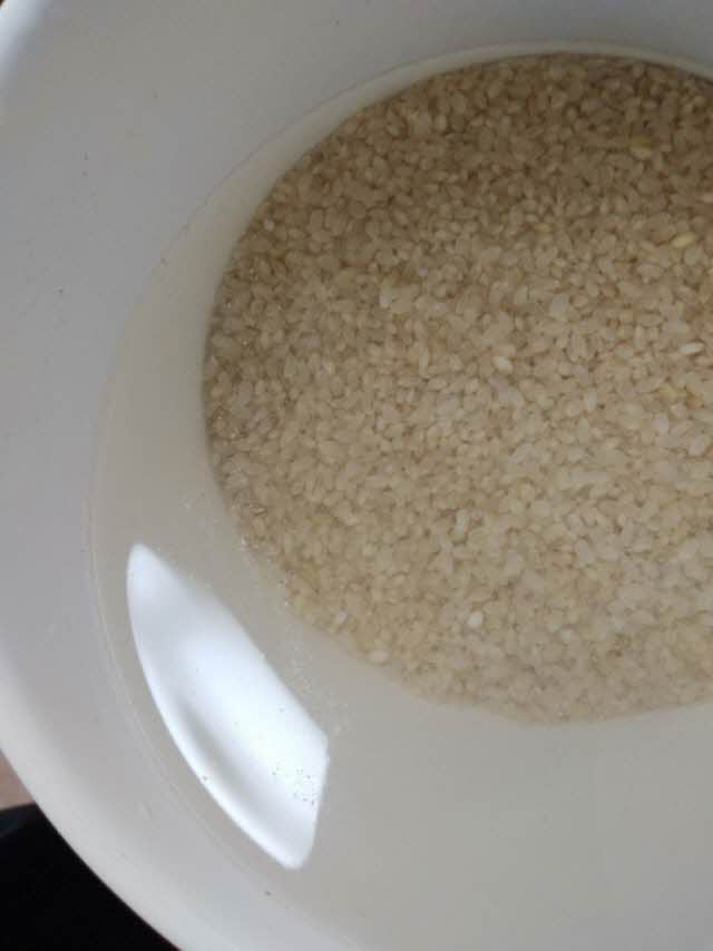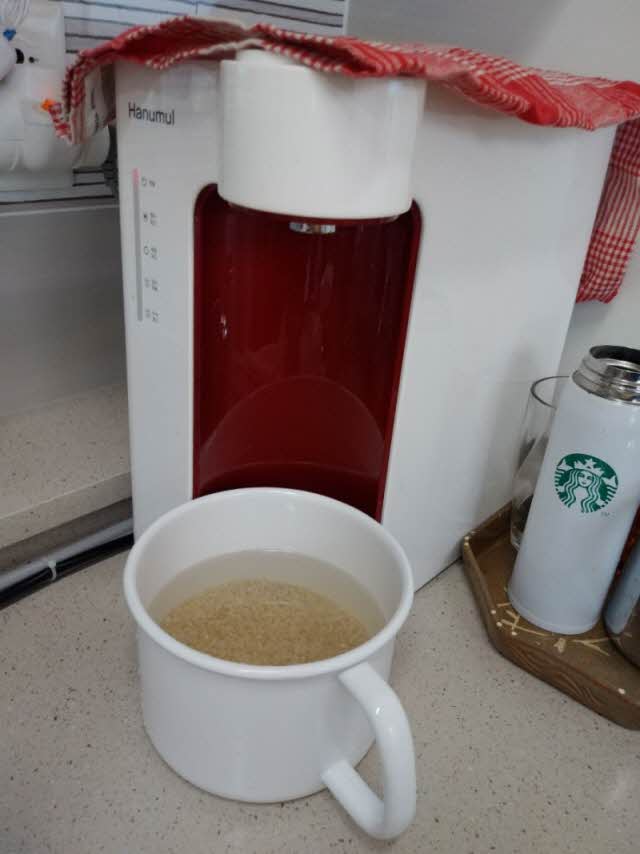 한우물 정수기 물을 먼저 받고 그 위에 쌀을 붓는다 쌀에 붙어 있던 불순물이 물위로 뜬다.(먼지 등이 아주 많이 뜬게 바로 보인다)
